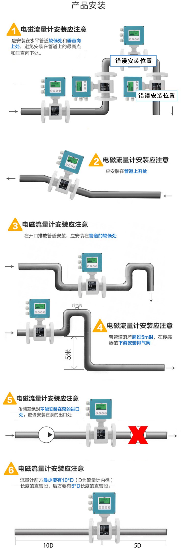 - 在流量計的進出口應保留一定長度的直管段一般要求至少5-10倍的管徑(D),以確保流場穩定。