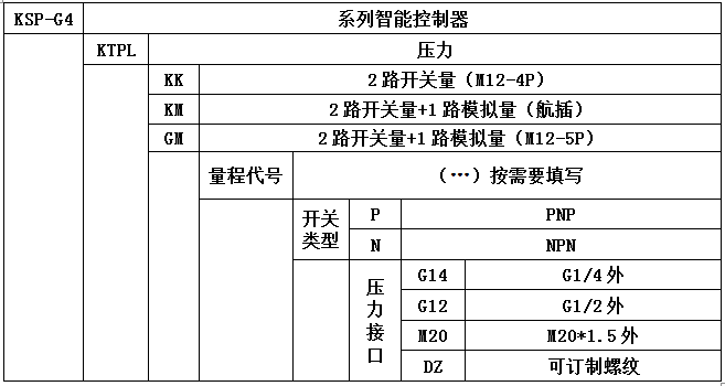 KSP-G4系列智能控制器是集壓力、溫度、液位的測量、顯示與控制為一體的智能開關(guān)。該產(chǎn)品為全電子結(jié)構(gòu),前端采用進(jìn)口高精度傳感器,輸出信號由高精度、低溫漂的放大器放大處理,送入高精度的A/D轉(zhuǎn)換器,轉(zhuǎn)換成微處理器適用的數(shù)字信號,通過數(shù)字信號對控制系統(tǒng)壓力進(jìn)行測控及開關(guān)控制。